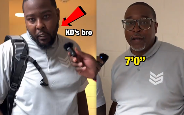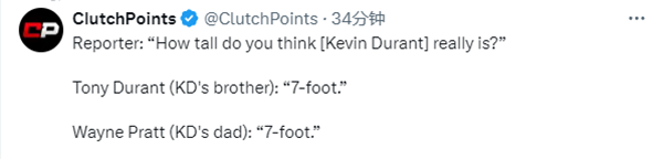 对此杜兰特本人表示:那些家伙肯定比他们说的要矮。我身高2米06(6尺9),阿德巴约看起来应该只有2米03(6尺8)吧,而不是2米08,浓眉应该勉强有2米06。他们肯定虚报身高了,我从不虚报身高。