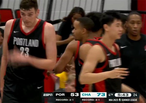今年夏联开拓者首战不敌马刺,中国男篮全队来到现场观战,崔永熙未获得上场机会;今日对阵黄蜂,中国男篮集训队再次到场为小崔加油,终于见到小崔上场。