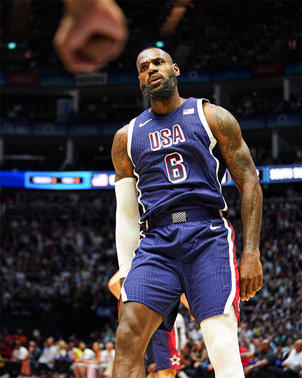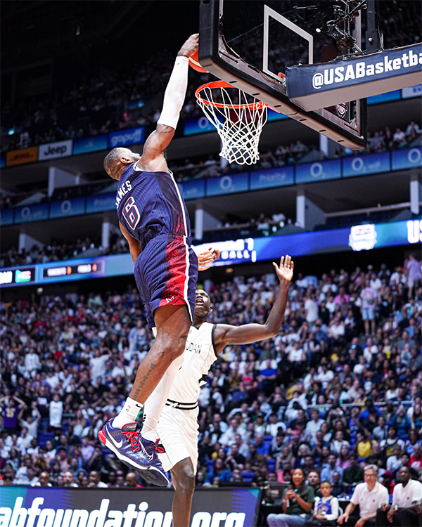 178直播讯 北京时间7月21日,奥运男篮热身赛美国男篮1分险胜南苏丹,39岁的詹姆斯开启全力詹模式,全场出战23分钟,14投10中独砍25分6篮板7助攻,多次霸气暴扣点燃球馆,终场前8秒上篮准绝杀。