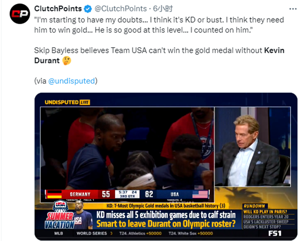 究竟杜兰特对美国队有多重要?名嘴Skip认为没有凯文-杜兰特,美国队就无法赢得金牌,他在节目中表示:我开始怀疑了,我认为要么是杜兰特,要么什么也得不到。我认为他们需要他才能赢得金牌,他在这个层次上太出色了,我信任他。