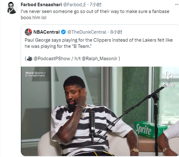 乔治嘲讽前东家快船引争议,快船队记Farbod Esnaashari转推评论道:“我从来没见过有人这么不顾一切地让球迷嘘他,哈哈。