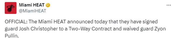178直播讯 北京时间7月26日,迈阿密热火官方宣布,球队与约什-克里斯托弗签下一份双向合同,同时裁掉双向合同后卫锡安-普林。