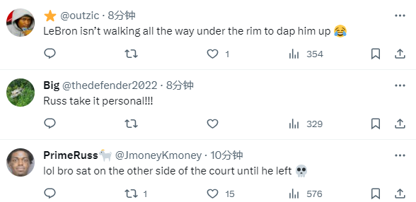 如此一幕引热议,美球迷表示“威少这是针对个人的”“威少一直站在球场的一端直到他离开”“詹姆斯没有走到底线和他拥抱”。