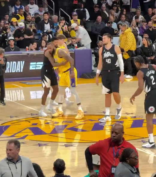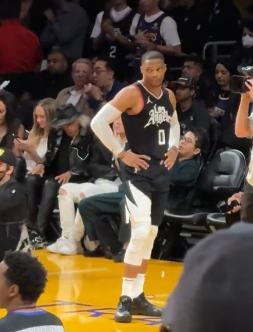 湖人和快船比赛开打前,詹姆斯在中圈附件与小卡、乔治、祖巴茨以及海兰德握手拥抱,此时威少并不在中圈,而是站在球场的一端,等到詹姆斯和快船众将致意结束后,威少才扭头走过来。