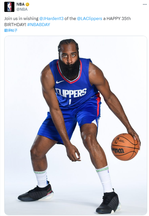 NBA官方、快船官方都发推晒照祝贺哈登35岁生日快乐。