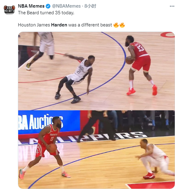 美媒NBA Memes晒出哈登化身脚踝终结者的画面,写道:火箭时期的哈登太与众不同了;美媒ClutchPoints发推写道,时间回到2022年,哈登在他的生日派对上把蛋糕扔进了大海,祝大胡子生日快乐。