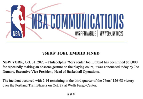 178直播11月01日,NBA官方公布罚单,76人球星恩比德因在比赛中多次做出下流的庆祝动作被联盟追加罚款,被罚3.5万美元。