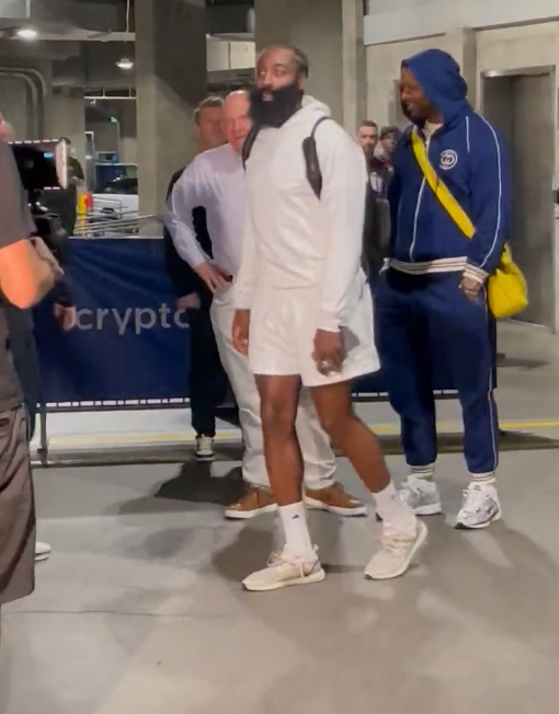 哈登身穿白色连帽卫衣和短裤、背着双肩包来到快船球馆,塔克则穿着一套深色套装,他们一起亮相,快船老板鲍尔默和总裁劳伦斯-弗兰克都亲自出面迎接他们,鲍尔默拥抱哈登和塔克,哈登咧嘴大笑凸显心情,之后鲍尔默带着他们走进球馆内部。