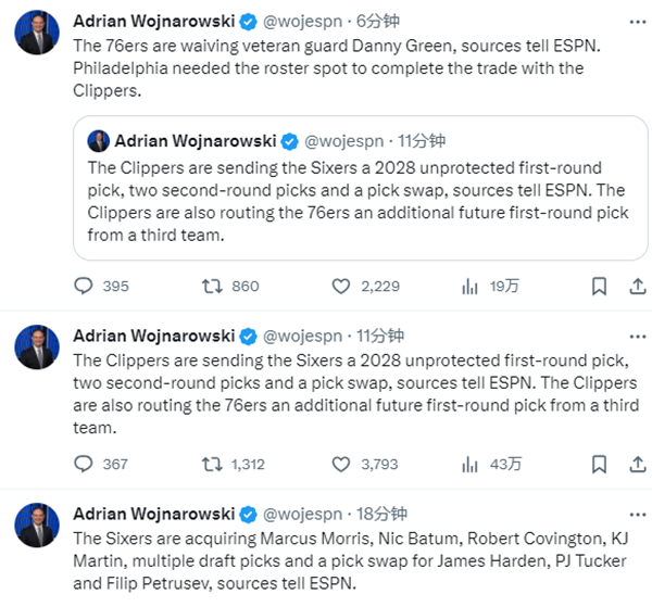 据名记woj报道,76人送出哈登、塔克和彼得鲁舍夫,从快船得到莫里斯、巴图姆、考文顿、小马丁、多个首轮选秀权以及首轮互换权。