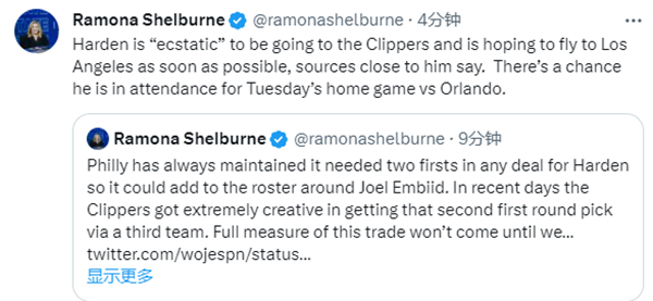 名记Ramona Shelburne报道,哈登身边的消息人士透露,哈登对加盟快船“欣喜若狂”,并希望尽快飞往洛杉矶。同时,哈登有可能观看快船周三对阵魔术的比赛。