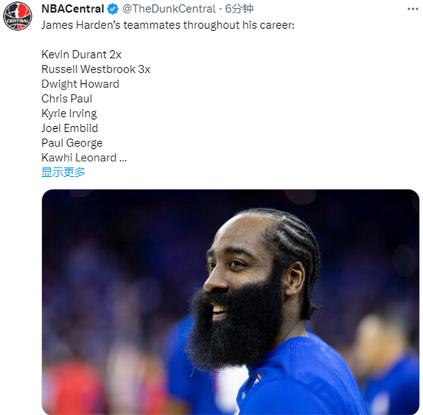 美媒NBA Central晒出了哈登生涯搭档过的明星队友:杜兰特(2次)、威少(3次)、霍华德、保罗、欧文、恩比德、乔治、莱昂纳德。