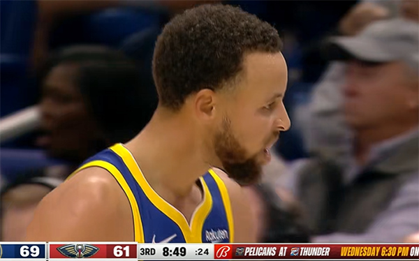 下半场,库里第三节再次开火,外线三分依旧不可阻挡,晃得霍金斯找不到方向,并且稳稳轰进三分,随后露出发狠表情,不过这一球库里伸腿调整时与对手拌在一起,后者摔倒引主场球迷不满;还有一次争议吹罚,库里造琼斯犯规,后者不满抱怨吃T,库里三罚两中;库里带队拉开分差,4分33秒库里下场休息,保罗带队掌控局面。