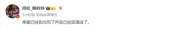 拜伦-斯科特还透露,库里飞往沈阳的航班延误了,不过目前库里已经飞到沈阳并且已经回到酒店了。