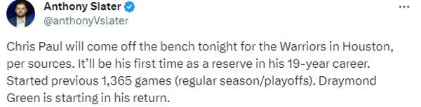 据勇士随队记者Anthony Slater赛前报道,克里斯-保罗将在对阵火箭的比赛中为勇士替补出战,这是19年职业生涯第一次担任替补,连续1365场(常规赛+季后赛)首发纪录终结,追梦格林复出进入首发;勇士官方晒照欢迎格林回归。