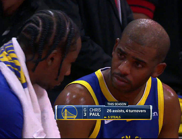 第二节,保罗急停跳投迎着申京命中生涯替补首球,上半场最后3分多钟,勇士祭出三后卫阵容,保罗搭档库里和汤普森,保罗助攻汤普森、维金斯,助勇士半场57-47领先10分,保罗半场3投1中拿到2分4篮板7助攻,正负值+23;期间,保罗还亲自指导库明加,为后背传授经验。
