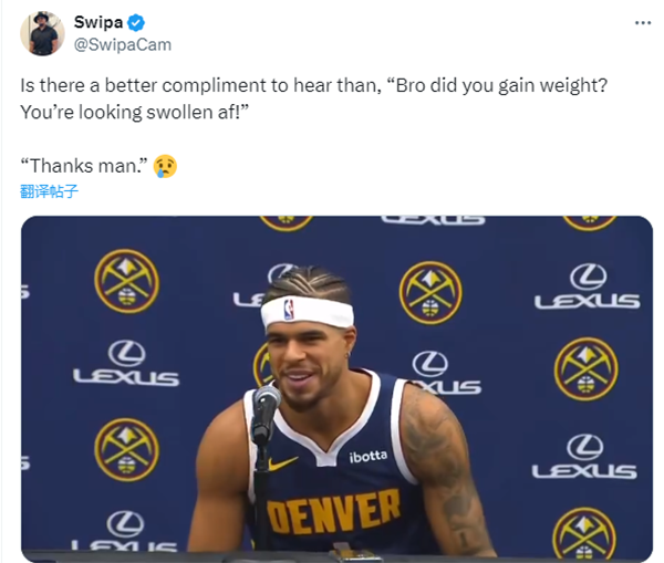 178直播讯 北京时间9月27日,掘金队正式为新赛季召开媒体日,期间被问到增重变胖,小迈克尔-波特大笑回应,并透露目前体重约为214斤;新赛季小波特希望能够场均拿到20分。