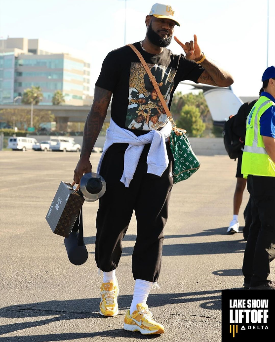 38岁的詹姆斯身穿运动裤、戴着白色棒球帽、斜跨价值1万多美元的名牌包包亮相,时刻不忘带着保温杯,对着镜头比手势,不过此时詹姆斯眯着眼,这表情太有趣了。