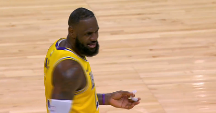 上半场,詹姆斯上场15分钟,11投4中拿到11分6篮板4助攻,因不满判罚抱怨裁判吃到技术犯规。
