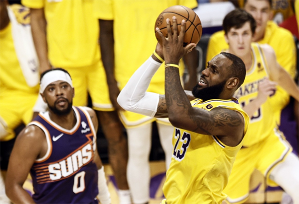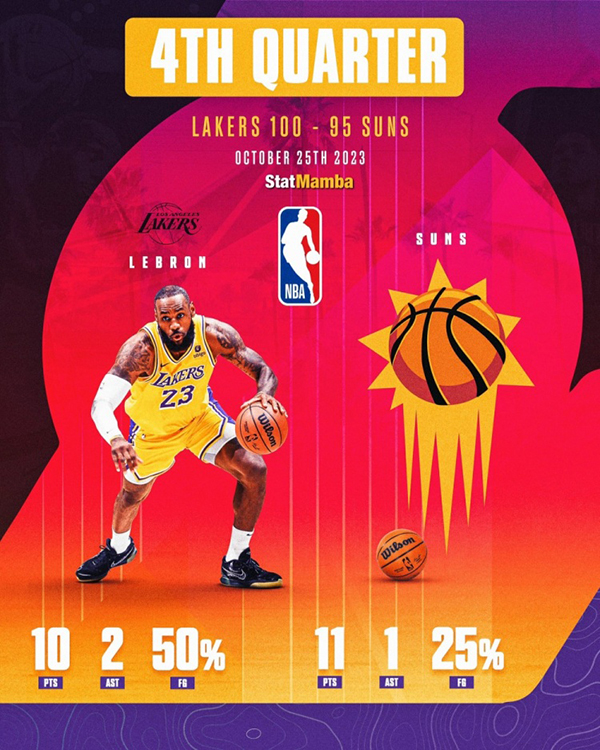 在湖人击败太阳的比赛中,詹姆斯前三节上场23分钟拿到11分,末节打满12分钟拿到10分2助攻(转化为4分),投篮命中率50%,末节一人独造14分超太阳全队末节得分(11分1助攻,命中率25%,杜兰特一人贡献9分)。