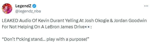 据报道,在太阳和湖人比赛中,詹姆斯持球突破杀到禁区造犯规,死球期间,杜兰特爆粗不满队友奥科吉和古德温没有协防詹姆斯,当时杜兰特大喊大叫,表示:别特么等着防他,别特么站着不动,去帮助协防他(勒布朗),带着明显的意图打球,这样他就不能获得上篮的机会,你不能像那样一个人防他。