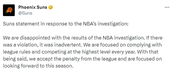 太阳官方第一时间回应NBA调查的声明: 我们对 NBA 的调查结果感到失望。如果有违规,也是无意的。我们每年都致力于遵守联赛规则并参加最高水平的比赛。话虽如此,我们接受了联盟的处罚,并专注于展望本赛季。