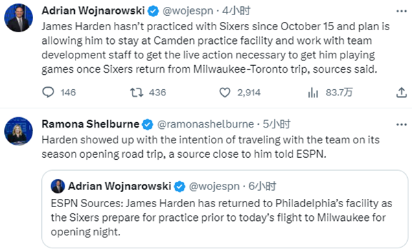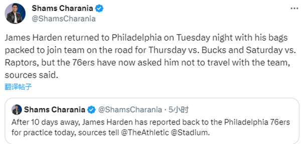 名记shams报道,哈登已经归队参加了球队的训练,他准备参加76人与雄鹿和猛龙的客场比赛,但76人要求他不要随队出行。