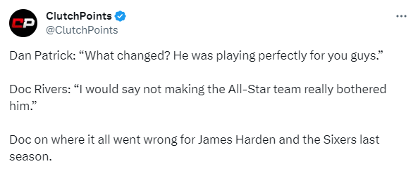 在被问及哈登本来打得挺好、但中间出了什么问题让他发生改变时,里弗斯透露:你问对人了,我觉得没能入选明星真的很困扰他,他是联盟助攻王,他的三分命中率生涯最佳,但是教练就是没选他。他没有说出来,但是我能感受到。记得在那件事后,他跟我说,他想要更多的与球队第二阵容一起在场,我就知道他的意思了,他想要更多的投篮出手。从那之后我们就经历了起伏。