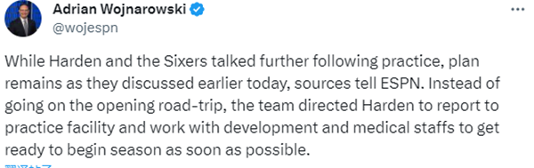 尽管哈登和76人在训练后进一步进行了交流,但还是保持原有计划(不前往客场)。76人没有让哈登踏上揭幕战的客场之旅,而是指示他到训练馆报到,并与球队医疗人员一起为新赛季的开始做好准备。