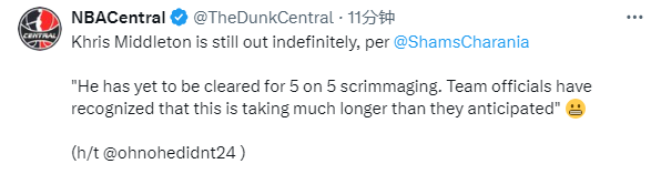 雄鹿开赛战绩糟糕还有坏消息,据名记shams报道,米德尔顿仍无限期缺战,他还没有被允许参加5对5对抗赛,球队管理层已经意识到这比他们预期的要花费更长的时间。