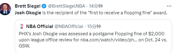 值得一提的是,太阳悍将奥科吉收到一张罚单,NBA官方宣布奥科吉在与勇士比赛中假摔被罚款2000美元;此战奥科吉全场9投7中,三分1中1,得到17分5篮板1助攻1抢断,帮助太阳命中关键三分。