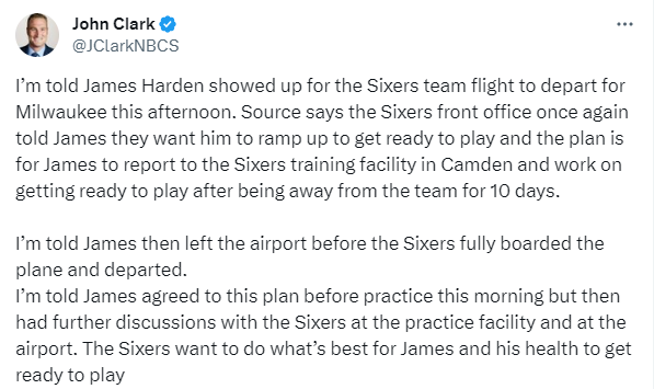 76人随队记者John Clark报道,哈登出现在了76人飞往密尔沃基的航班上,但球队管理层再次告诉哈登,球队希望他加强训练、为比赛做好准备。哈登的计划是在离队10天后,前往训练基地报到,并努力为比赛做好准备。