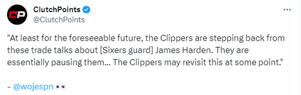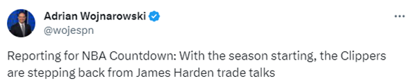 随后woj更新社媒报道,随着新赛季的开始,快船将退出哈登交易谈判。