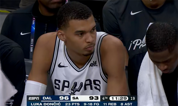 末节文班亚马上场仅仅只打26秒就吃到第5犯,无奈下场十分沮丧,只能坐在替补席观战;7分12秒文班冒险上场并且空接得分,迎着莱夫利再中3分,禁区霸气2+1(罚球不中)引爆全场,;暂停回来,文班迎着格威直接干拔得分,连得9分助马刺紧咬比分,东契奇和欧文关键时刻发力,东契奇三分杀死比赛,最终马刺主场惜败无缘赛季首胜。