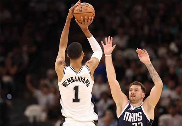 第一节,文班亚马开场就帽掉欧文的急停跳投,8分25秒文班亚马命中空位三分,打进NBA生涯首球,全场球迷为他鼓掌互换;打了5分钟后文班下场休息,2分25秒重新上场,上来就持球迎着防守轰进三分,之后因吃到第二犯被迫下场,马刺首节43-36领先7分。