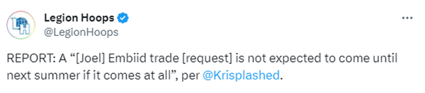 今夏恩比德曾公开表示不管是在费城还是其他地方,他只想夺得总冠军,如此言论暗示自己未来可能申请离队。