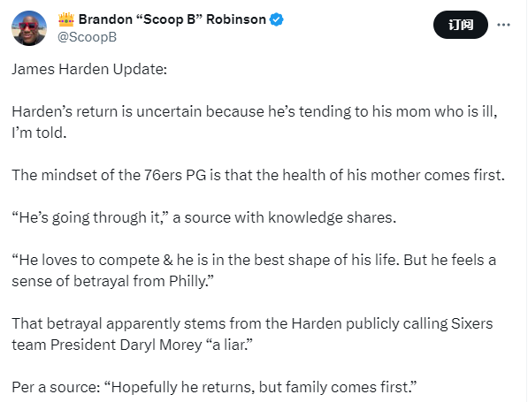 据名记Brandon Robison报道,据我所知,哈登的回归尚不确定,因为他正在照顾生病的母亲。 76人队控球后卫的心态是,母亲的健康是第一位的。