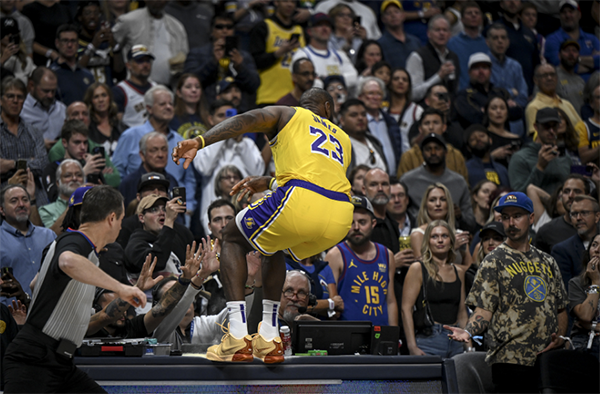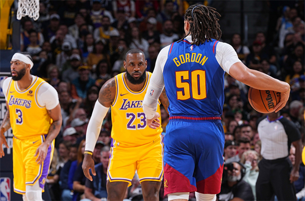 末节,詹姆斯突破上篮造戈登干扰球,之后外线命中三分,继续带领湖人追分,约基奇上场后稳住局面;最后6分钟,詹姆斯重新回来,助普林斯轰进追身三分,然后约基奇失误,湖人反击时老詹空切上篮,直接打停掘金。暂停回来,湖人被打7-0瞬间落后到两位数,詹姆斯强硬2+1,罚球不进,比赛还剩1分多钟,湖人提前放弃比赛,最终湖人不敌卫冕冠军遭遇新赛季开门黑。