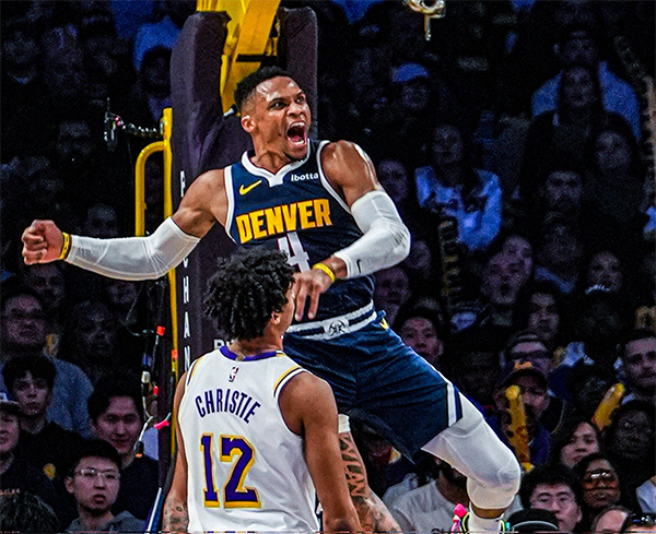 本场比赛,威少替补出战24分钟,10投6中拿到14分11助攻7篮板,末节4中4独砍10分,重返洛杉矶之战手刃旧主,末节威少命中三分后湖人撤下主力,此时威少冲着湖人观众席狂喷垃圾话,宣泄内心压抑已久的情绪,也是对球迷嘘声和骂声的一种回击。