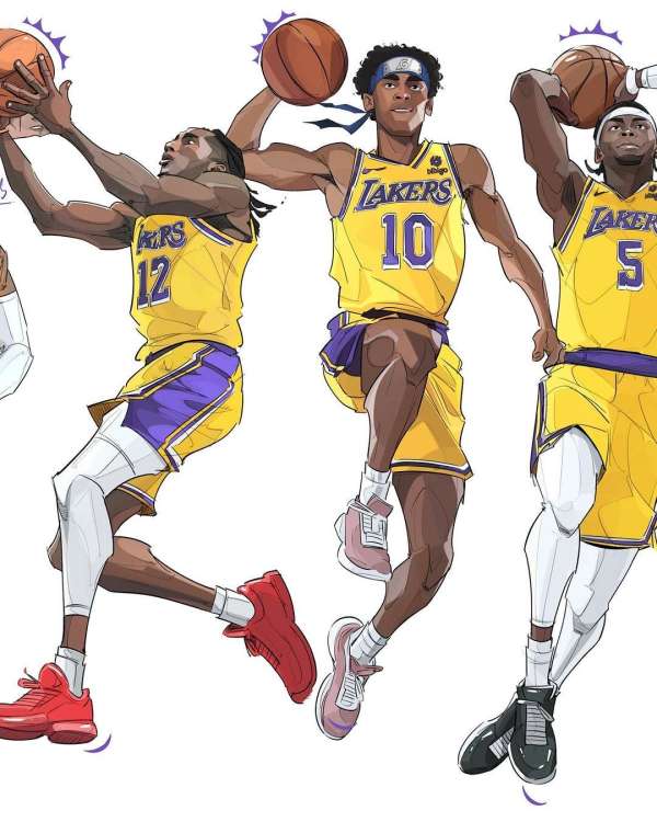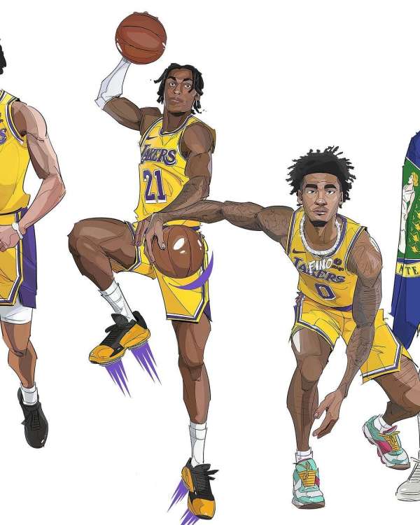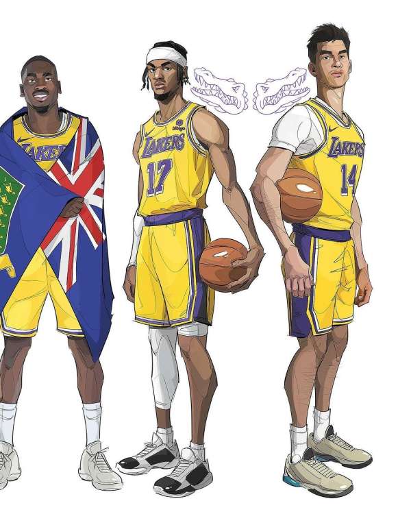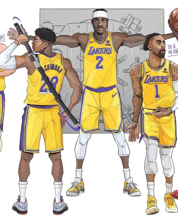 在湖人全队漫画版合影中,17名球员都在其中,詹姆斯和浓眉两大巨头位居C位凸显球队的地位,老詹身穿23号并且做出戴王冠的庆祝动作;浓眉戴着发带怒吼,八村垒身背日本武士刀十分抢镜。