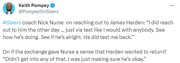 当被问及是否有在消息中与哈登谈到回归球队的事宜,纳斯表示:没有涉及任何具体的事,我只是想确保他没事。