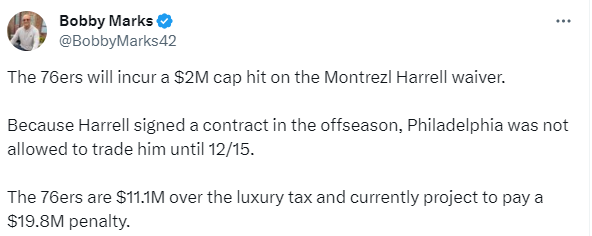 NBA薪资专家Bobby Marks跟进报道,裁掉哈雷尔让76人增加200万美元死钱;由于他们是在今夏与哈雷尔签约,所以费城要等到12月15日才可以交易哈雷尔。