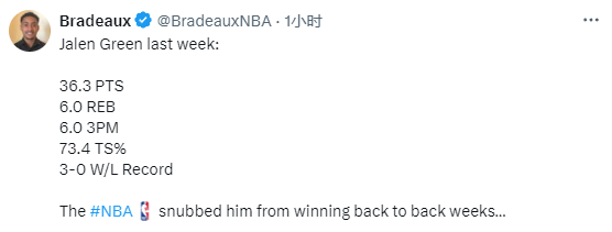 火箭队记Bradeaux表示NBA联盟冷落了他,让格林无缘蝉联西部周最佳。