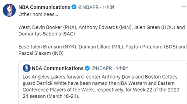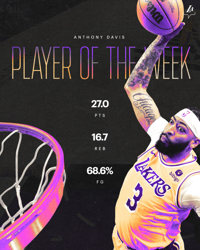 浓眉本赛季第一次当选西部周最佳,湖人生涯第5次以及职业生涯第10次当选,湖人官方第一时间祝贺浓眉,詹姆斯则是转发海报祝贺浓眉。