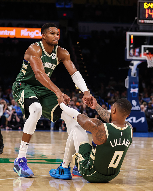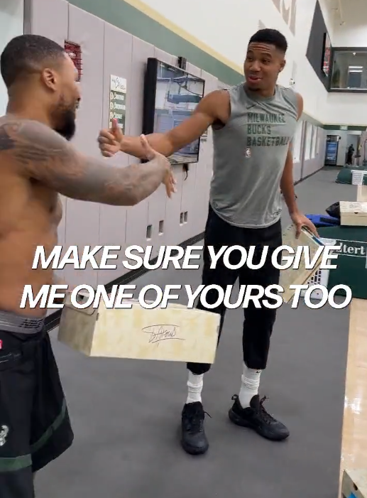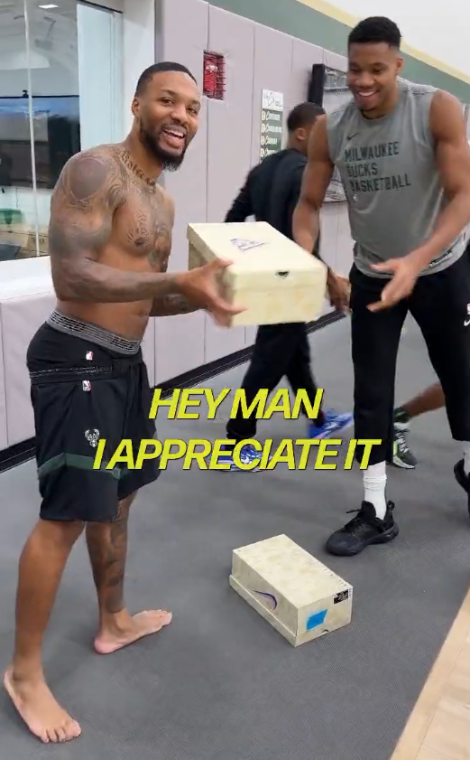 字母哥终于把礼物送给利拉德,当时利指导光脚以及赤膊出镜,接过鞋子后感谢字母哥;随后字母哥向利拉德索要鞋子:你的签名鞋也一定要给我一双;利拉德表示没问题。