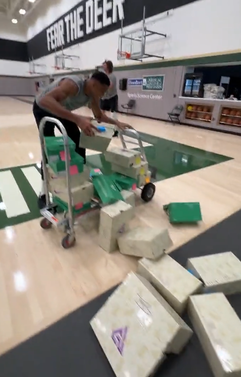 字母哥通过社交媒体晒出自己送鞋的视频,用小推车推着39双最新款球鞋;送鞋期间,米德尔顿看到贴着自己名字的球鞋,伸手去拿被字母哥开玩笑阻止,之后字母哥把鞋送给米神,后者表达感激之情。