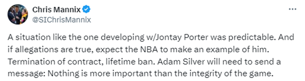 24岁波特涉嫌打假球引热议,名记Chris Mannix表示:像琼泰-波特这样的情况是可以预见的,如果指控属实,预计NBA将对他处以终止合同以及终身禁赛,此前萧华曾表示美元什么比比赛的完整性更重要。
