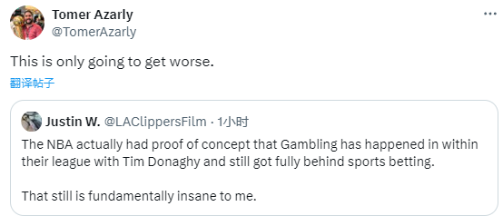 据悉,NBA联盟早已知晓联盟中存在打假球的现象,但他们仍旧全力支持体育博彩;快船记者Tomer Azarly表示这只会让联盟变得更糟糕。