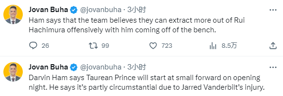 湖人主帅哈姆透露普林斯将在新赛季揭幕战中首发,另外四名首发分别是詹姆斯、浓眉、里夫斯和拉塞尔,这也是湖人季前赛最后一战的首发阵容;普林斯首发的主要原因是范德比尔特受伤了。