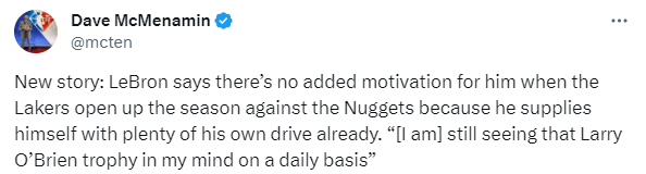 谈到湖人生涯,詹姆斯表示:当我来到这里时,我觉得我不想在这里无所事事,我是带着这样的想法来的——我想帮助这支球队重返季后赛,并且能够把另一个奥布莱恩杯放在珍妮-巴斯的办公室里。我做到了;我现在仍然想把这里的总冠军杯挪到一边,然后再放一个。