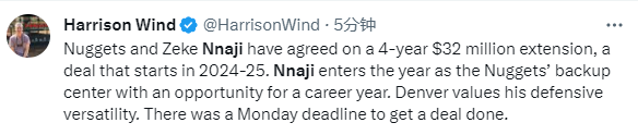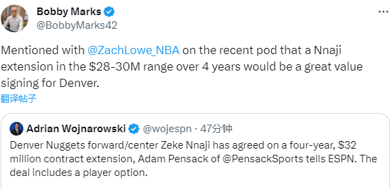 纳吉与掘金提前续签4年3200万美元新合同,此前NBA记者扎克-洛维表示对于掘金来说,给纳吉一份4年2800-3000万美元的合同是非常有价值的。